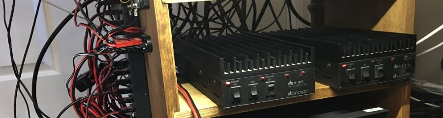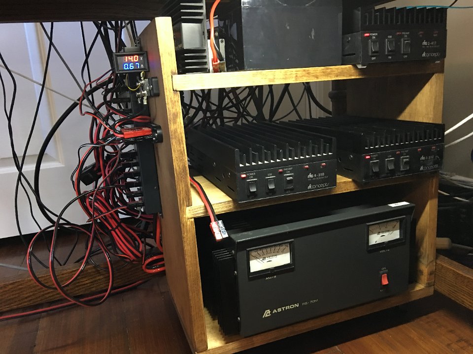 9 The 12V DC power distribution is mounted on the side. The Astron 70A power supply feeds a West Mountain Radio RIGrunner 8012 80A panel. One leg of the RIGrunner feeds a Powerwerk PD-8 8 port distribution block that is metered for voltage and current. I use this distribution block for all the low current devices. Anderson Powerpole connectors are used for all DC connections.